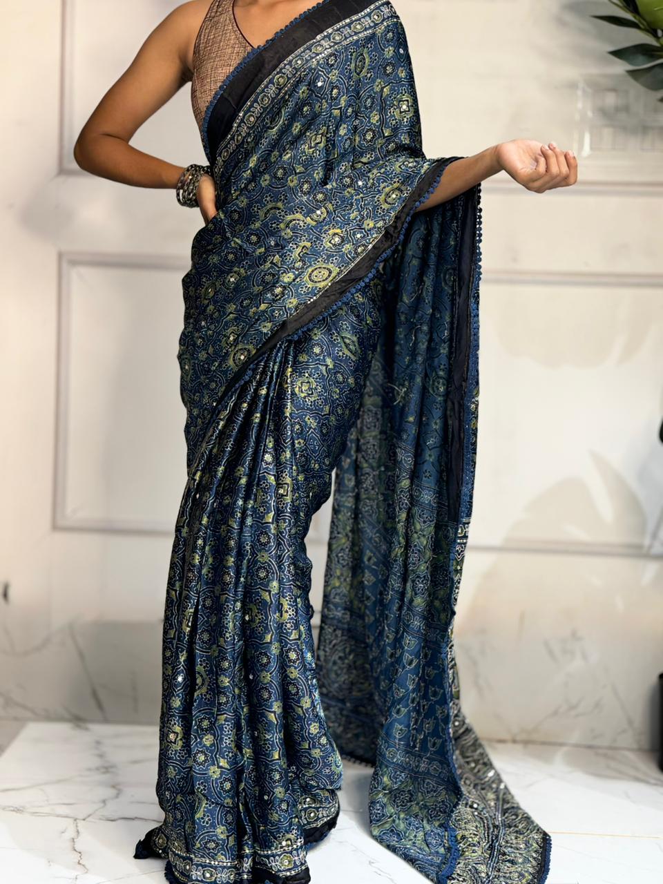 Bold, artistic, and effortlessly elegant — the Modal Ajrakh Saree (Ari Work)...