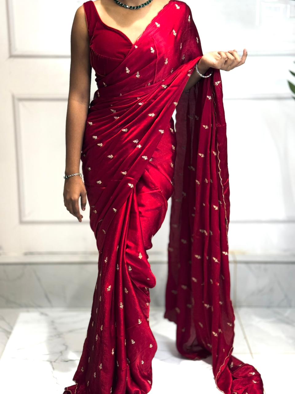 Glamorous, graceful, and gorgeously detailed — the Designer Satin Crepe Saree is...