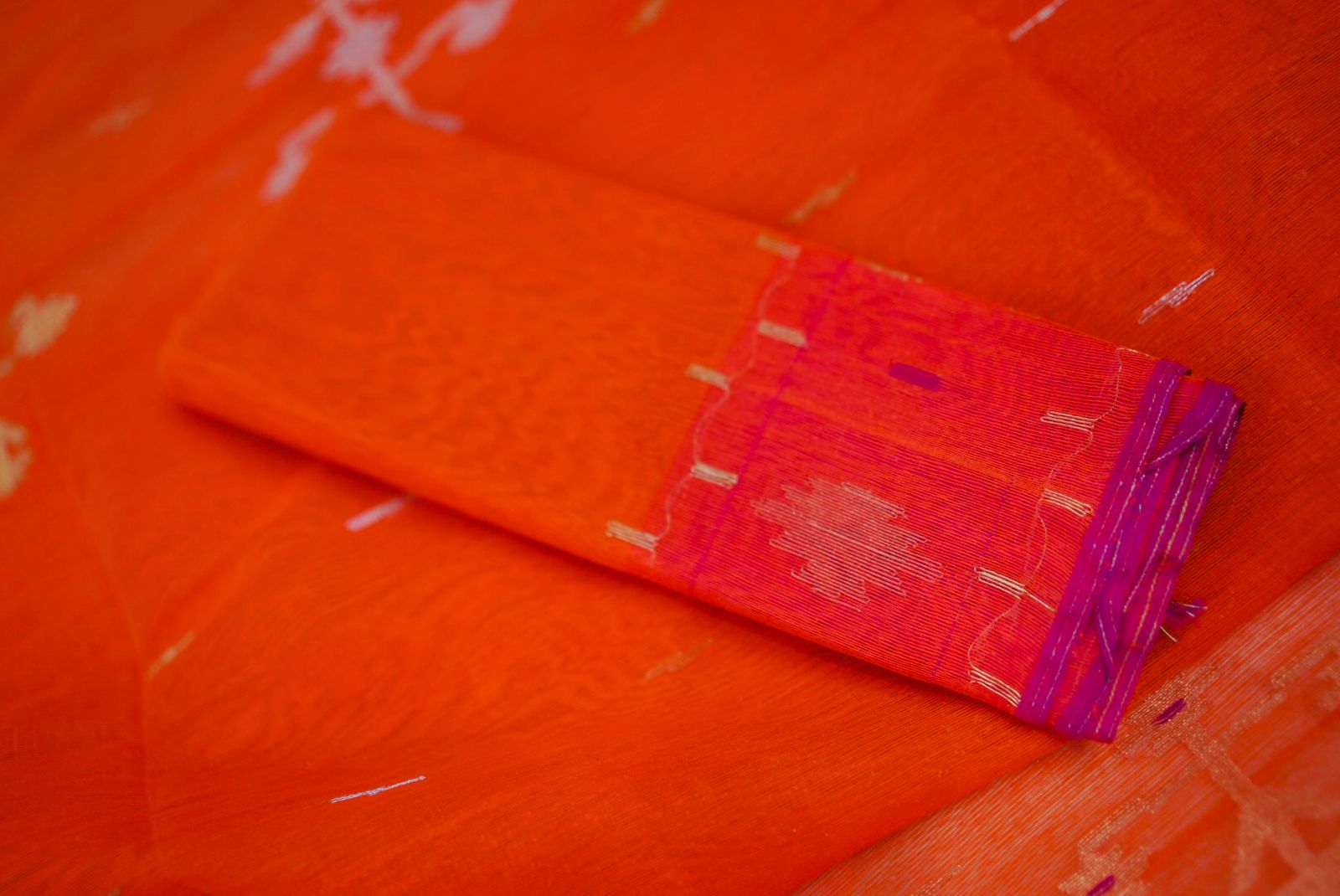 Design: Known for its intricate motifs — often inspired by flowers, vines, and geometric patterns — every Jamdani saree is a masterpiece of patience and craftsmanship. The motifs are woven directly into the fabric (not printed or embroidered), showcasing the true artistry of handloom weaving.