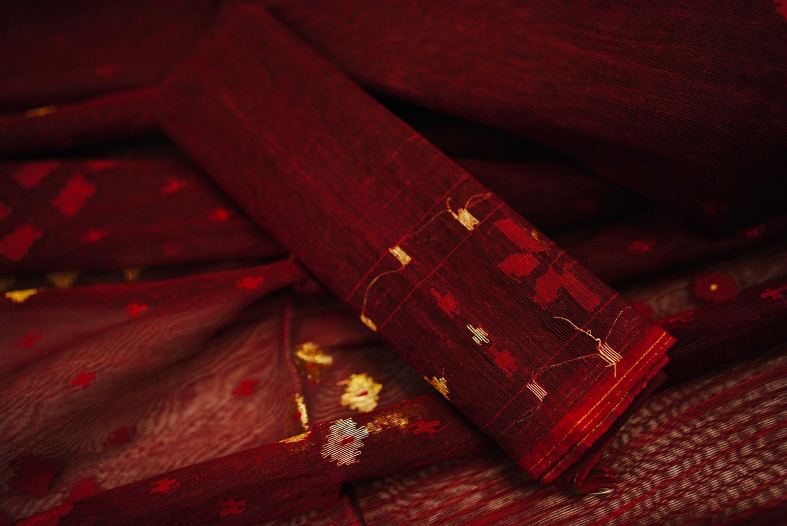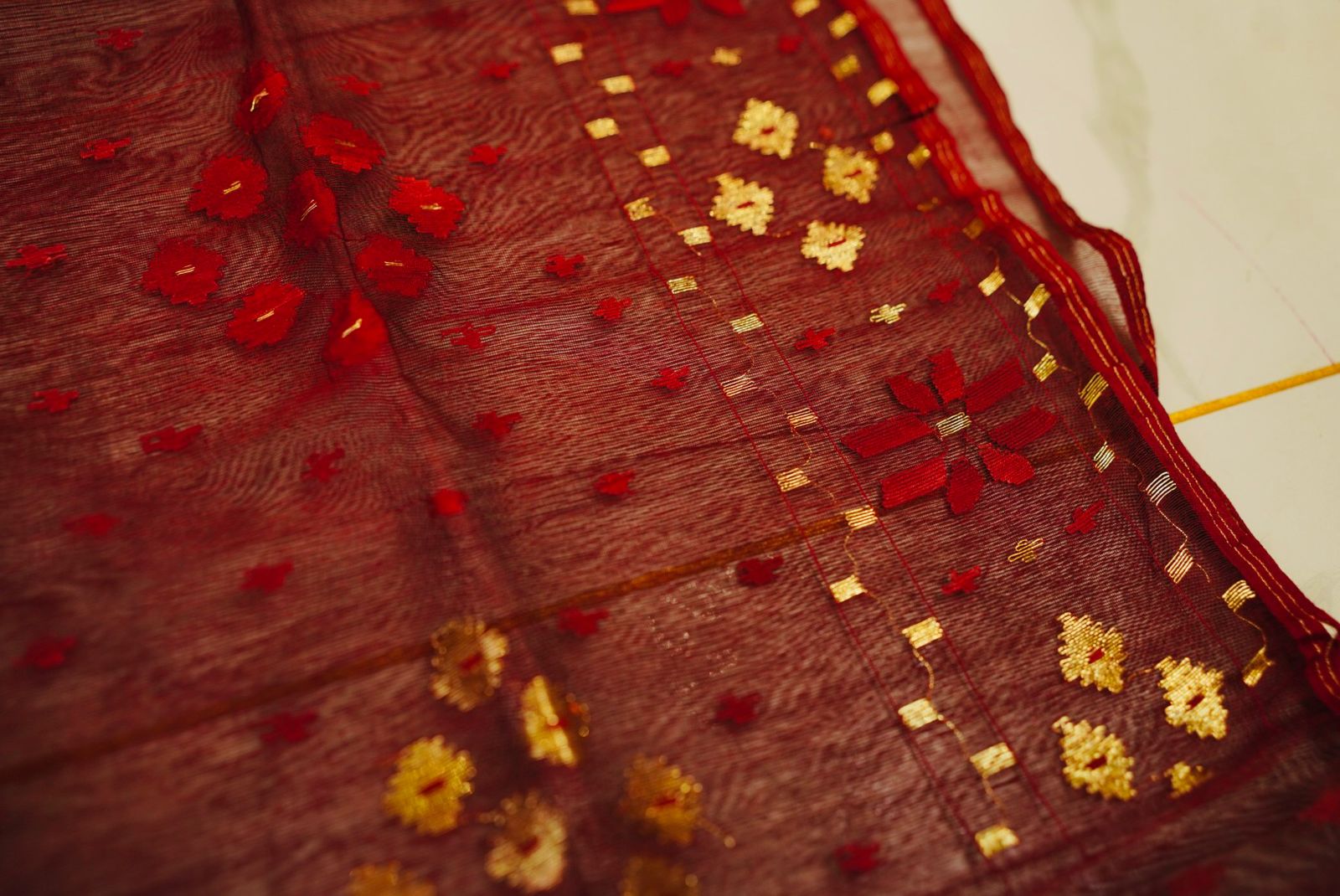 Design: Known for its intricate motifs — often inspired by flowers, vines, and geometric patterns — every Jamdani saree is a masterpiece of patience and craftsmanship. The motifs are woven directly into the fabric (not printed or embroidered), showcasing the true artistry of handloom weaving.