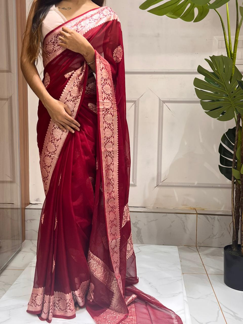 Design: Intricately woven Banarasi zari motifs, often featuring floral jaal, buttas, or classic meenakari touches. The delicate patterns shimmer subtly, giving the saree a refined royal appeal.