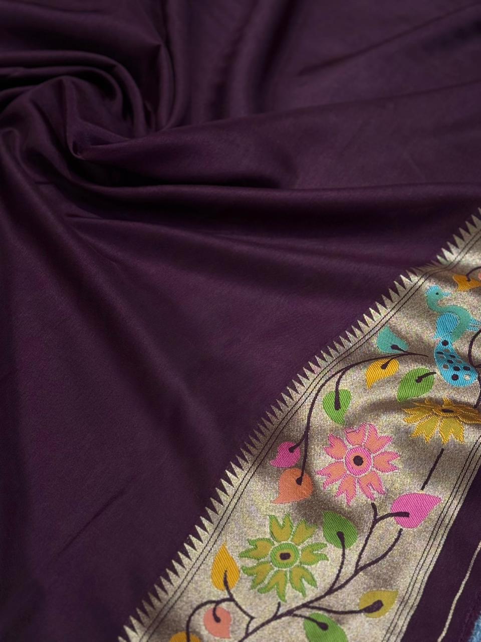 Design: Traditional Paithani motifs: peacock, lotus, parrots, or asawali vines,Rich zari pallu and border, usually handwoven or high-quality powerloom.