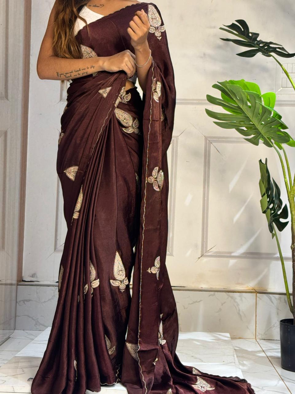 The Designer Satin Crepe Saree is where modern glamour meets timeless elegance. Its fluid drape accentuates your silhouette, while the intricate designer work adds a rich, luxurious touch. Perfect for making a statement — this saree ensures you dazzle effortlessly at every event.