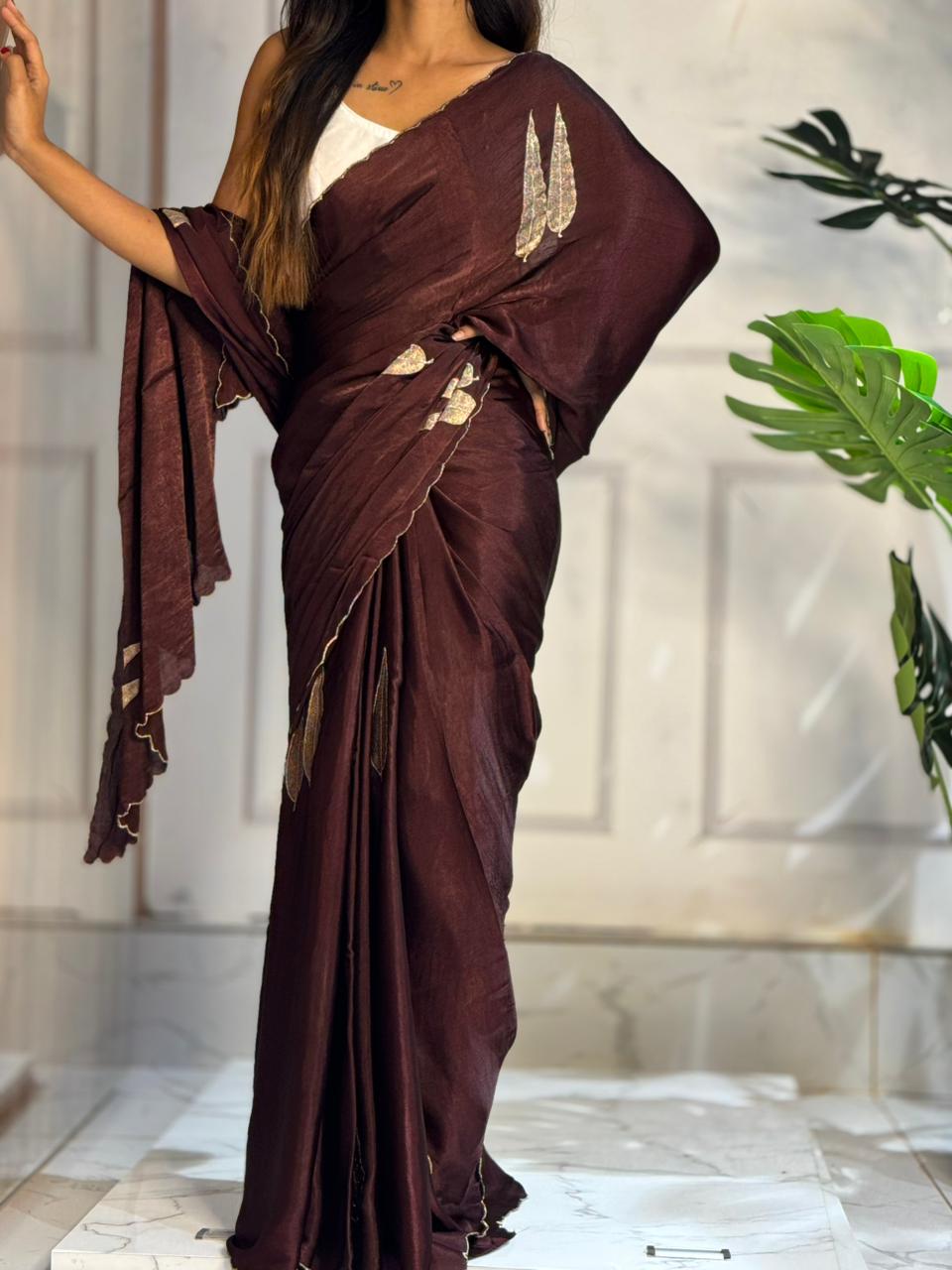 Glamorous, graceful, and gorgeously detailed — the Designer Satin Crepe Saree is crafted to make every occasion shine. With its luxurious satin sheen and fluid crepe drape, this saree beautifully blends sophistication with contemporary design elements.