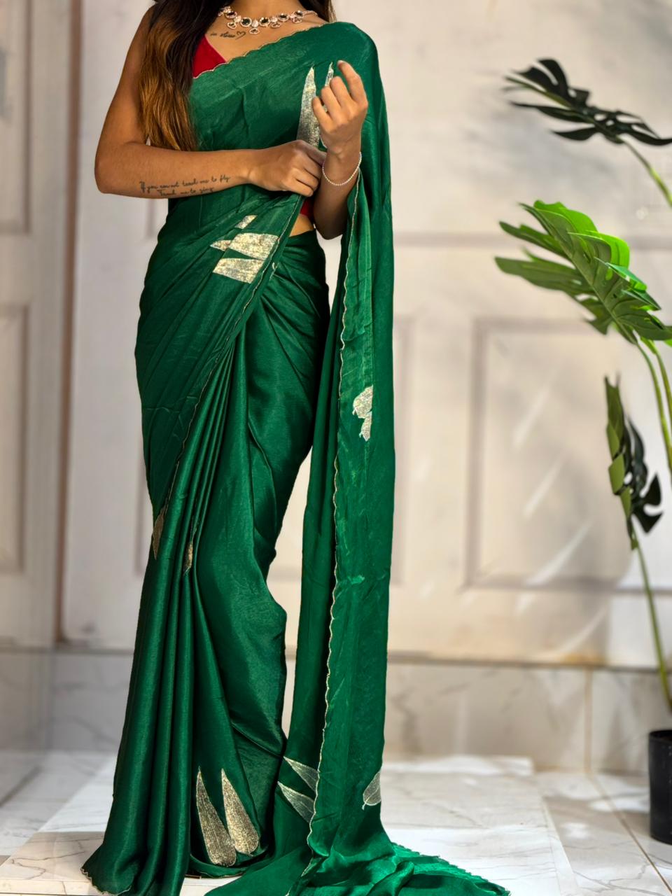This saree combines the sleek elegance of satin with the fluid drape of crepe, offering a perfect mix of comfort and glamour. Whether styled traditionally or with a modern twist, it ensures you stand out with timeless grace.