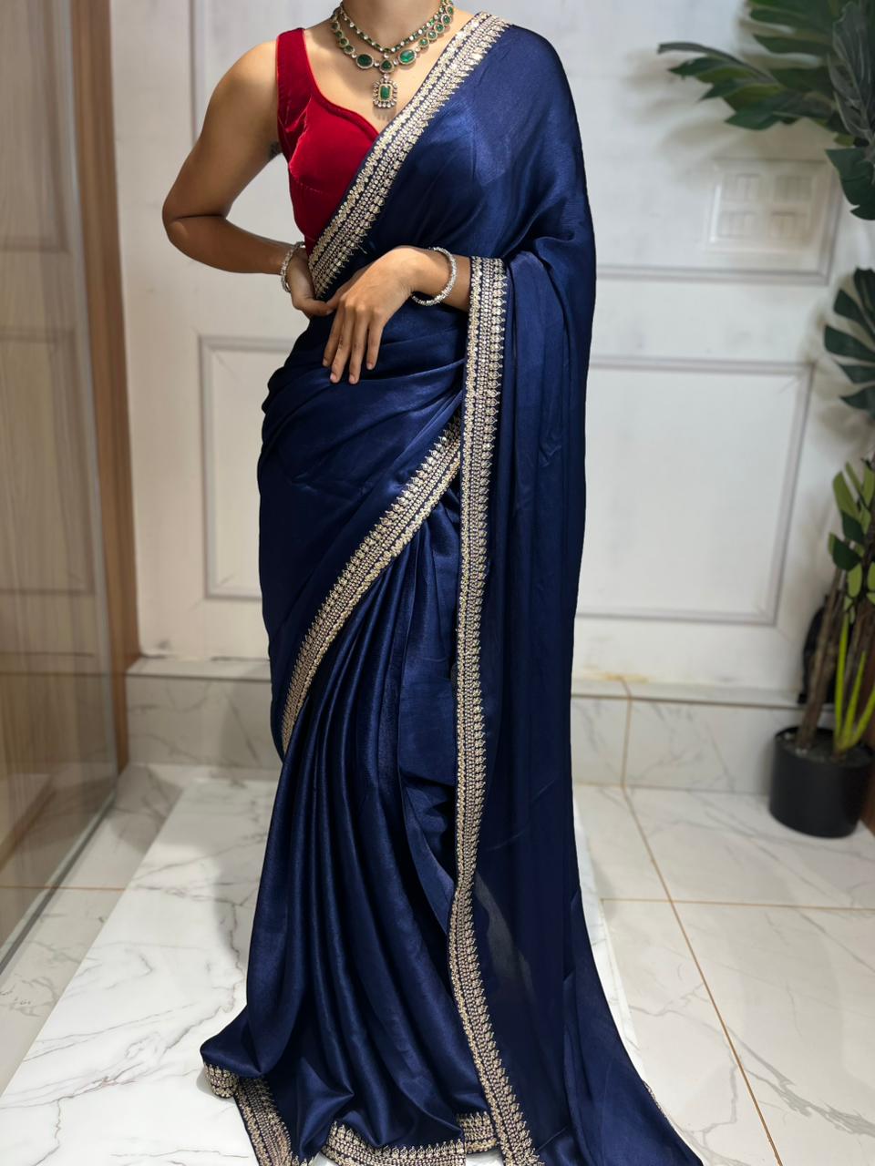Glamorous, graceful, and gorgeously detailed — the Designer Satin Crepe Saree is crafted to make every occasion shine. With its luxurious satin sheen and fluid crepe drape, this saree beautifully blends sophistication with contemporary design elements.