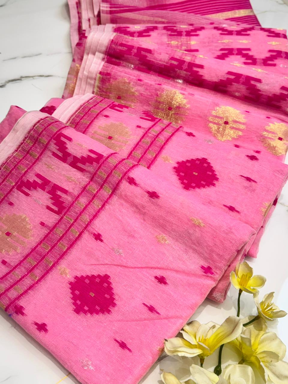 Delicate, graceful, and richly traditional — the Bengal Dhakai Saree is a true symbol of Bengal’s weaving heritage. Known for its airy texture, intricate motifs, and exquisite craftsmanship, this saree brings together timeless elegance and cultural charm in every drape.