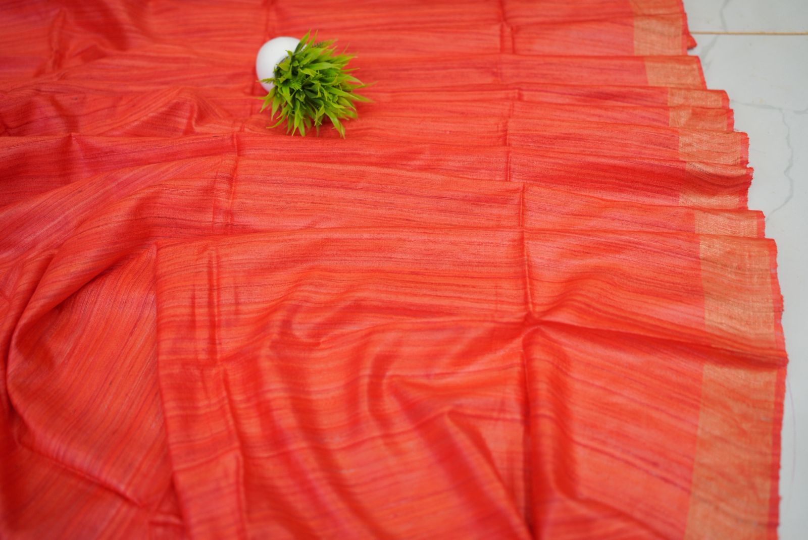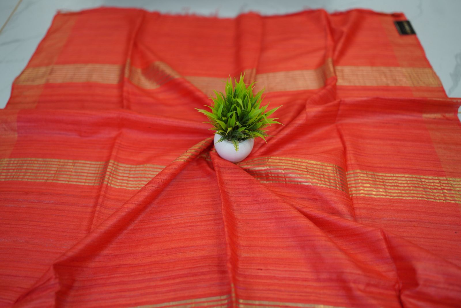 Fabric: Crafted from Ghicha silk, a byproduct of Tussar silk, these sarees are known for their unique texture and natural sheen. Each drape carries the rustic charm of hand-spun threads, giving it a raw yet elegant appeal.