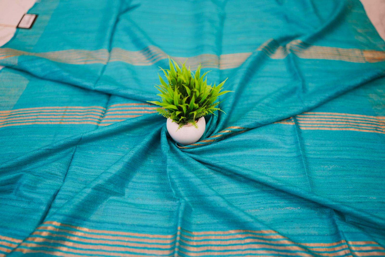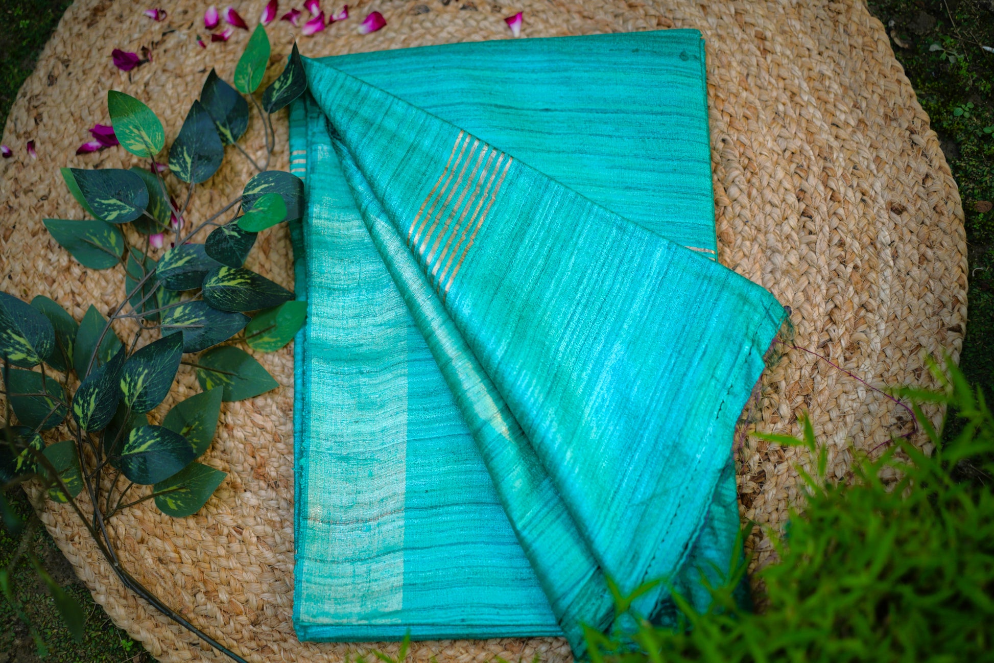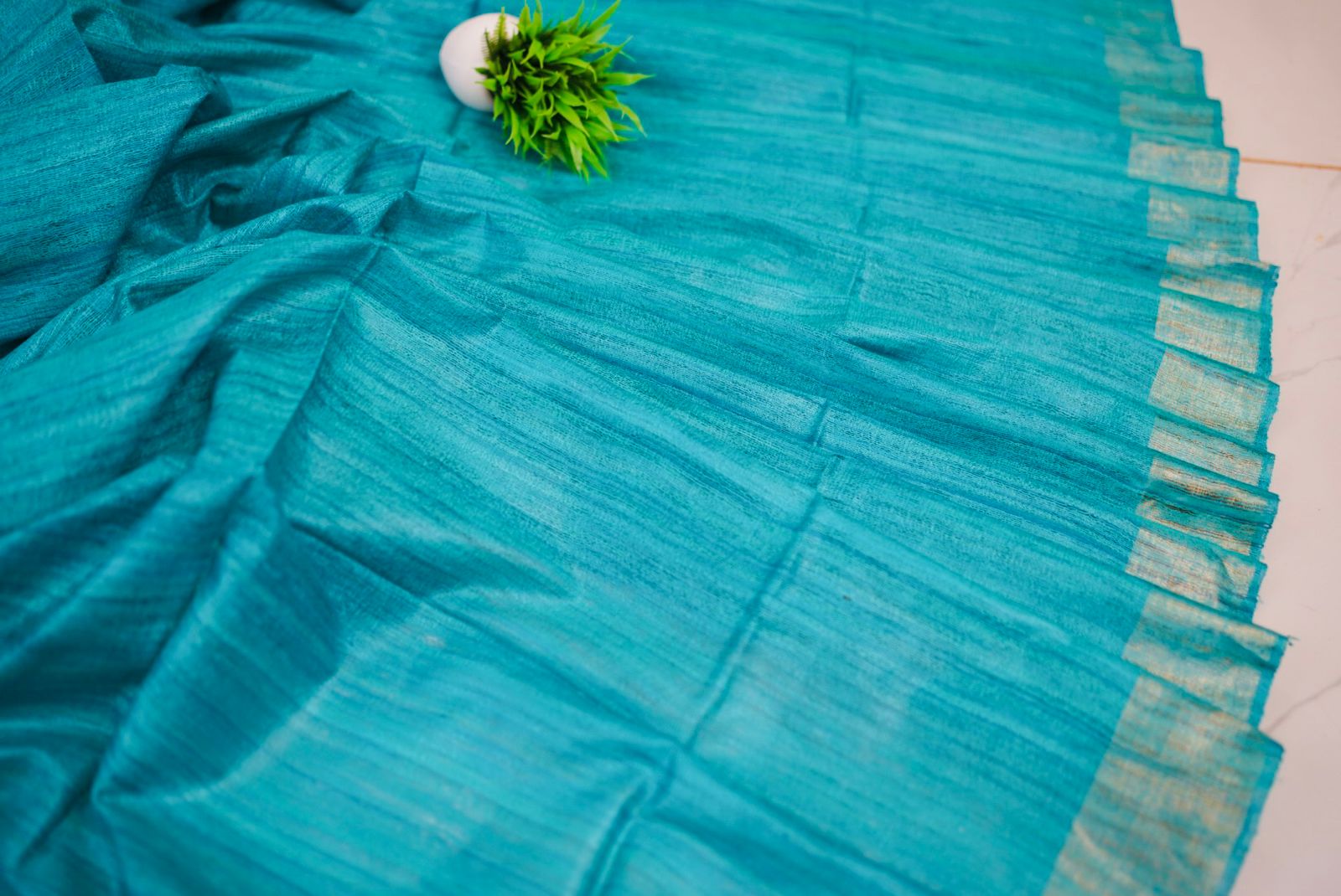 Fabric: Crafted from Ghicha silk, a byproduct of Tussar silk, these sarees are known for their unique texture and natural sheen. Each drape carries the rustic charm of hand-spun threads, giving it a raw yet elegant appeal.