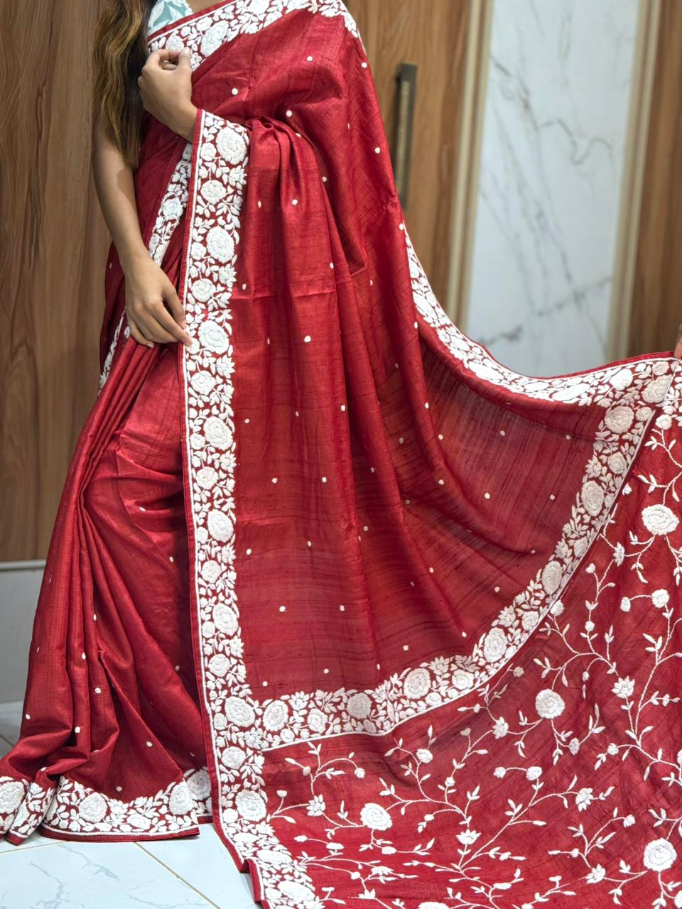 A masterpiece of craftsmanship, this Pure Hand Parsi Tussar Saree combines the luxurious feel of Tussar silk with the delicate artistry of traditional Parsi embroidery. Each motif is meticulously hand-stitched, making every saree a unique expression of elegance, heritage, and timeless beauty.