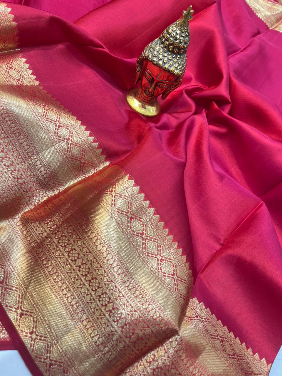 Premium pure Kanchipuram silk known for its glossy texture, durability, and rich feel.