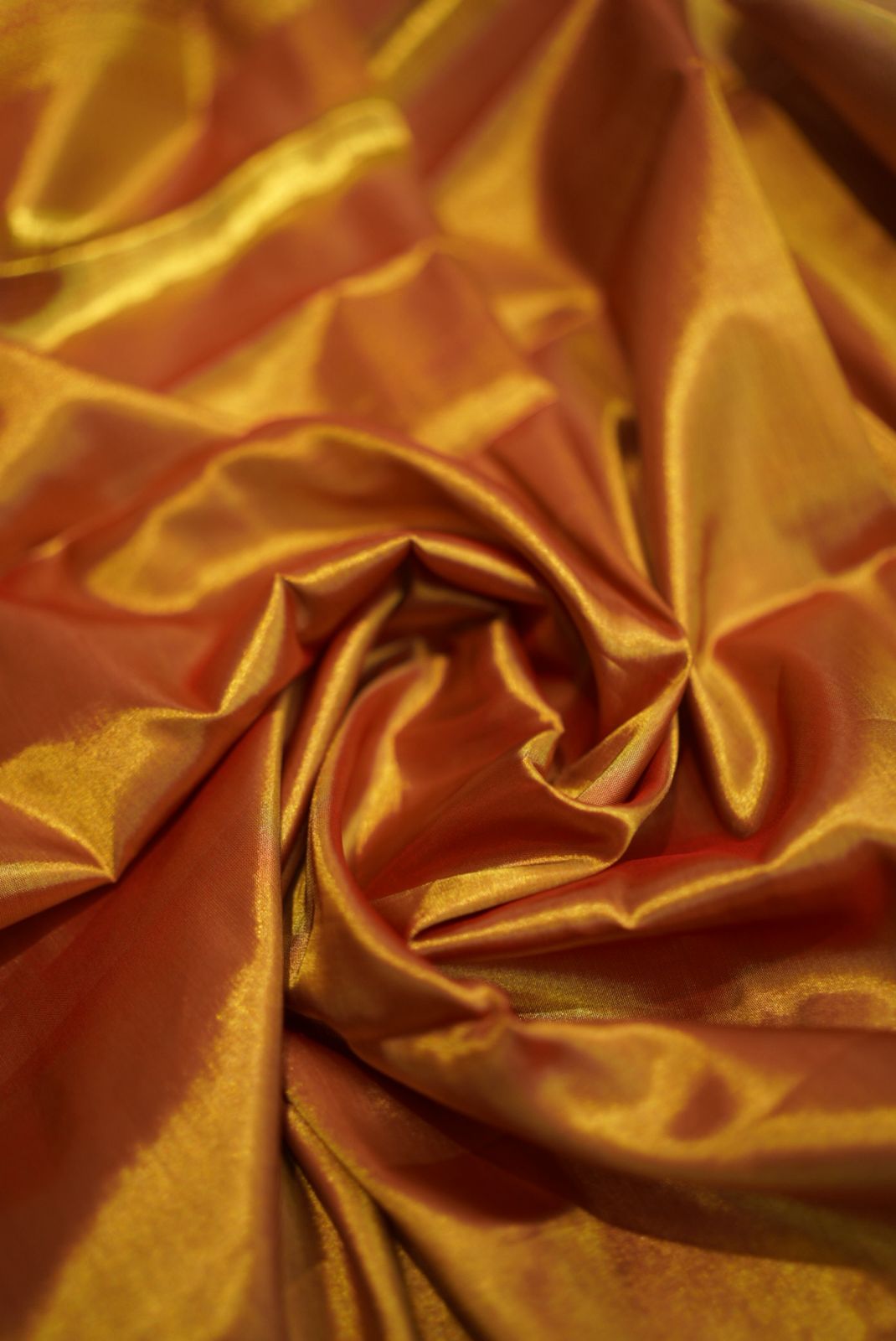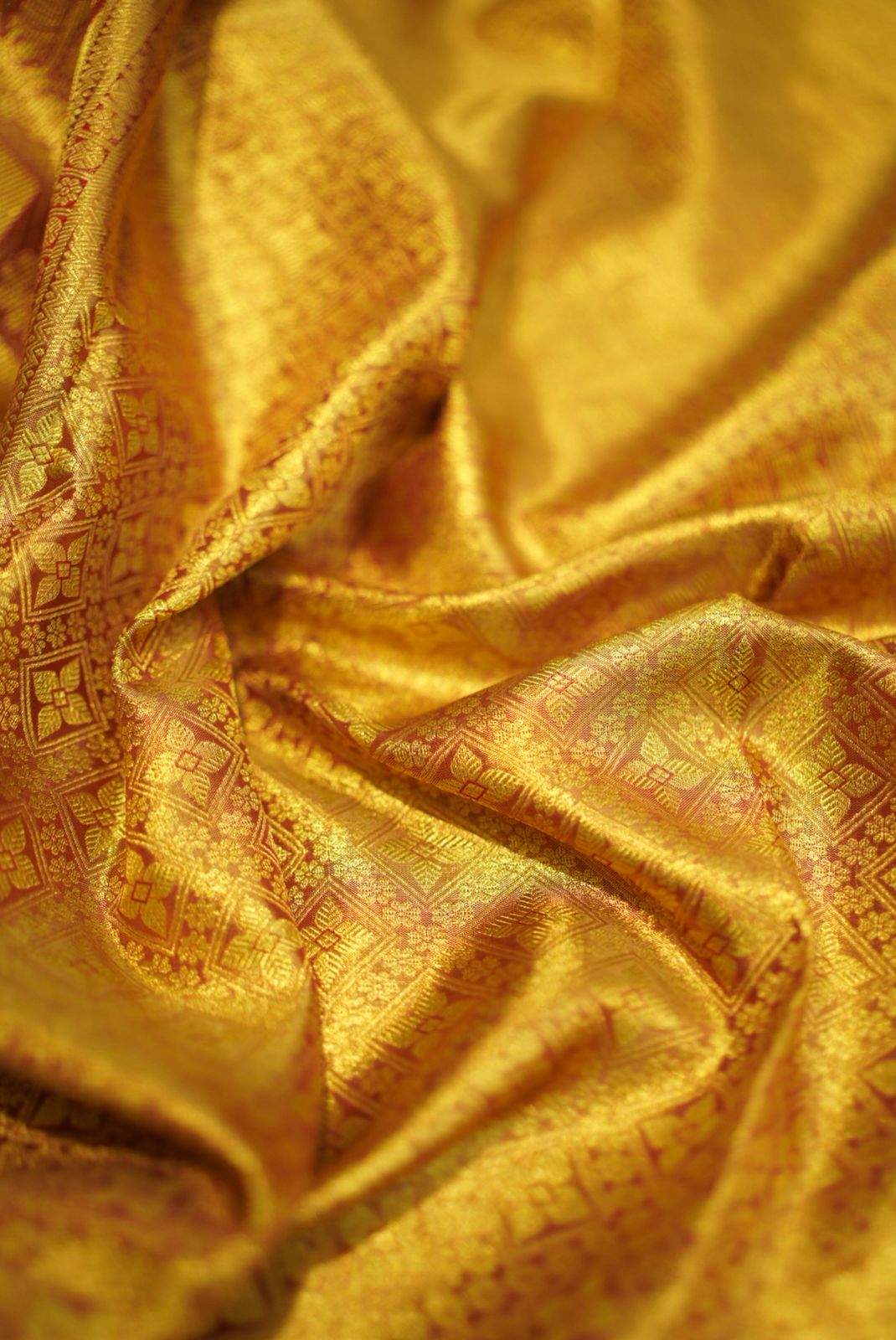 Made of pure silk with real tissue (zari) interwoven, giving it a glowing, metallic sheen.