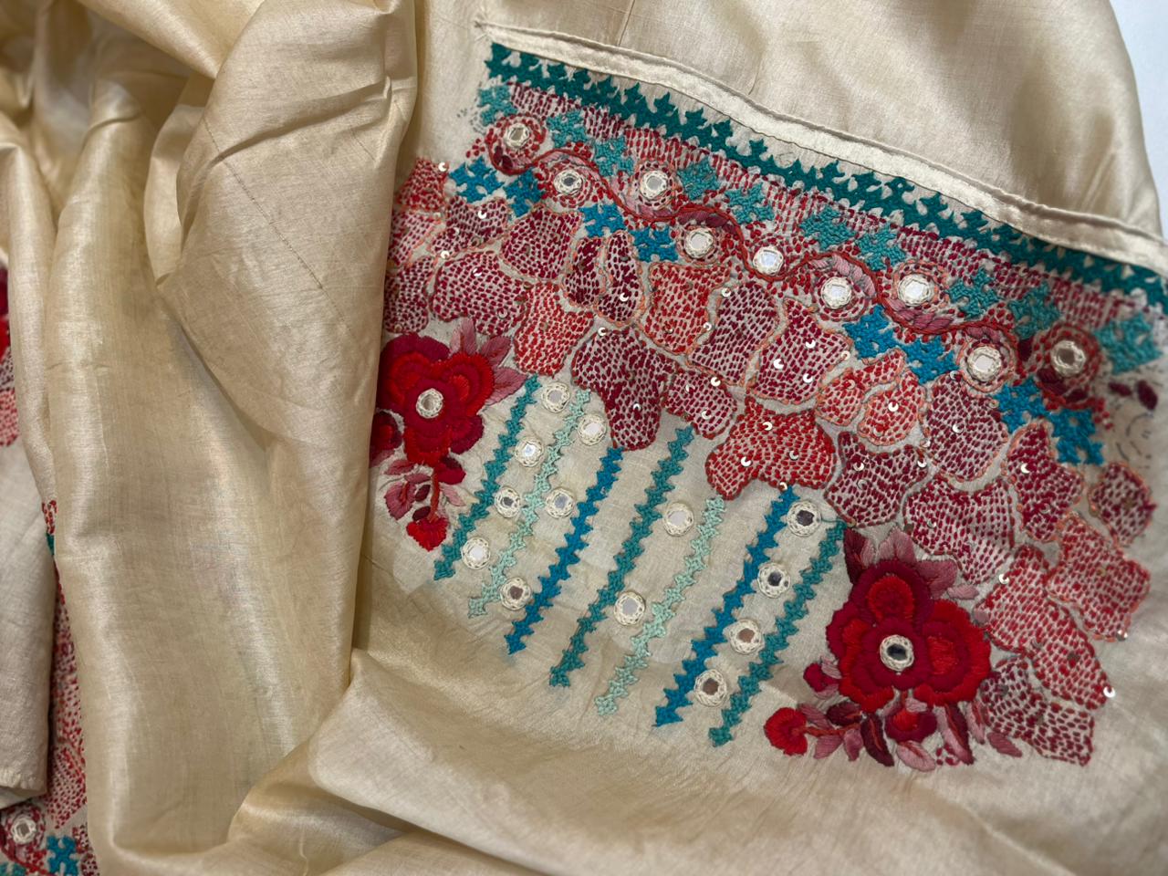 Design: A perfect blend of raw silk charm and vibrant craftsmanship — every detail is handcrafted, giving the saree a unique, artistic finish.