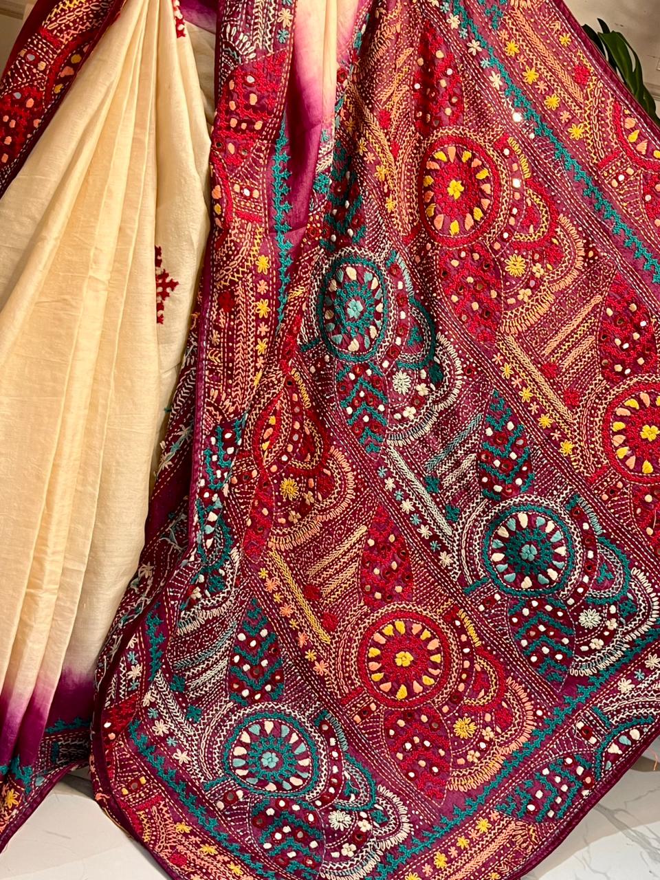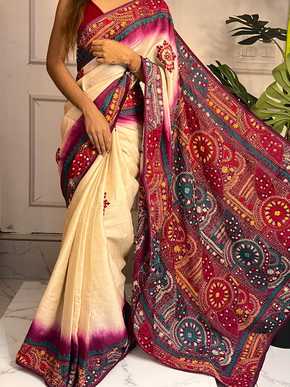 Design: A perfect blend of raw silk charm and vibrant craftsmanship — every detail is handcrafted, giving the saree a unique, artistic finish.