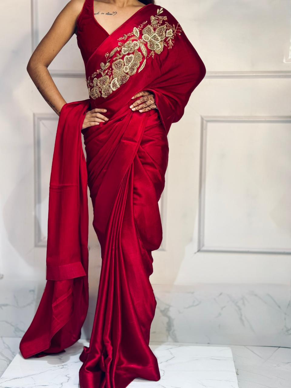 Glamorous, graceful, and gorgeously detailed — the Designer Satin Crepe Saree is crafted to make every occasion shine. With its luxurious satin sheen and fluid crepe drape, this saree beautifully blends sophistication with contemporary design elements.