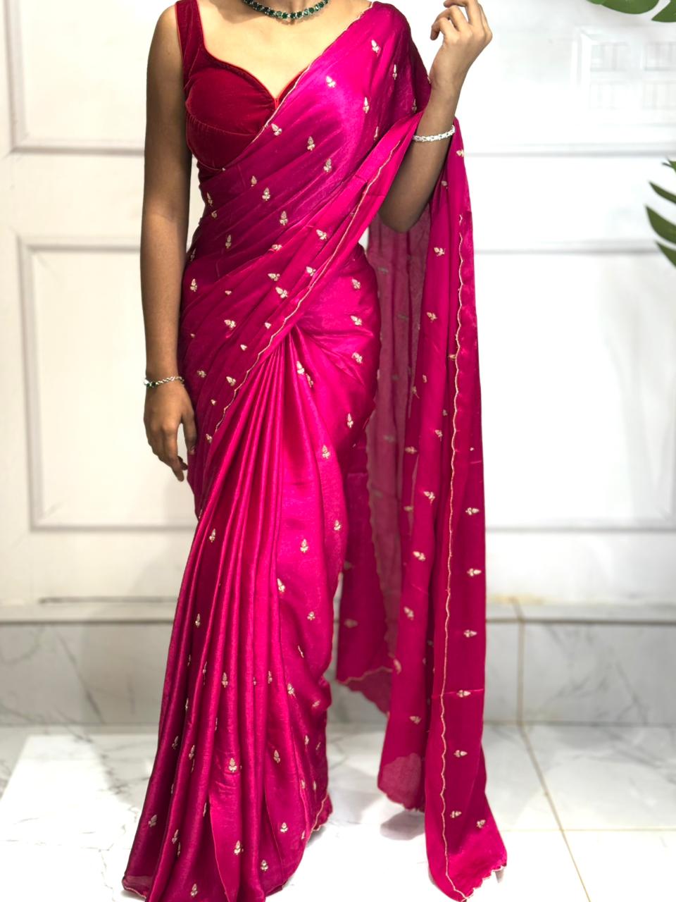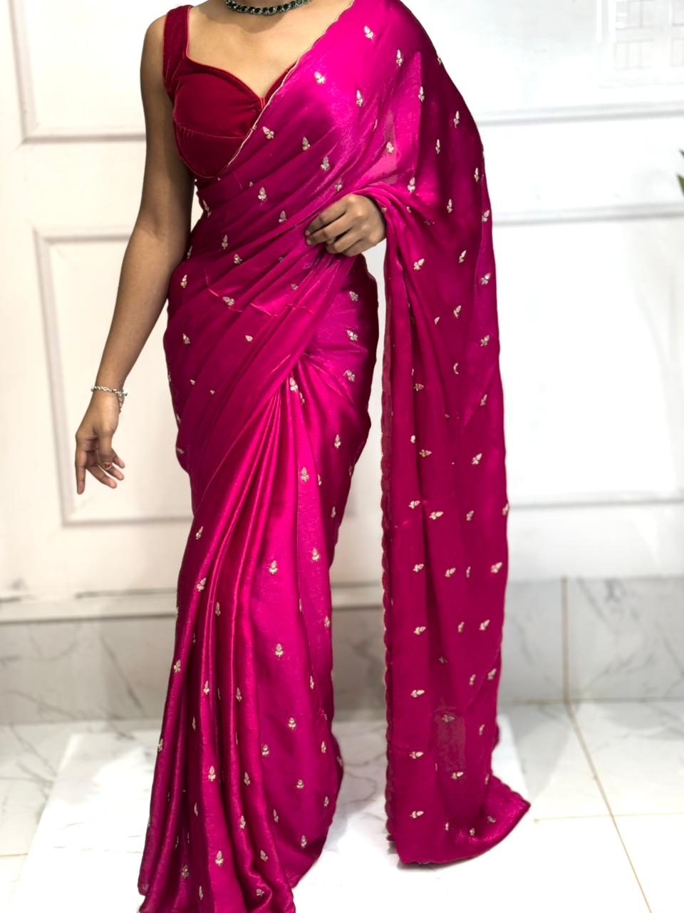 Glamorous, graceful, and gorgeously detailed — the Designer Satin Crepe Saree is crafted to make every occasion shine. With its luxurious satin sheen and fluid crepe drape, this saree beautifully blends sophistication with contemporary design elements.